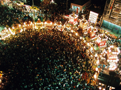 「上組」と「下組」にわかれ、それぞれの神輿と山車が観客の中を練り歩きます。